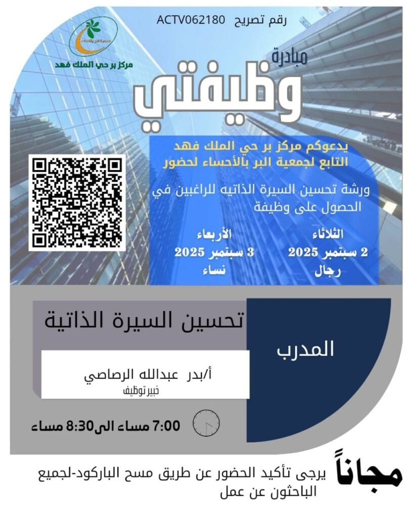 - المكان: جمعية البر – مركز حي الملك فهد