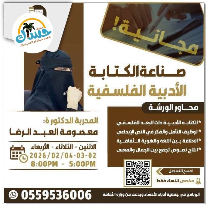 تنظمها جمعية أدباء الأحساء وبدعم من وزارة الثقافة، تدرب على الورشة الدكتورة معصومة العبد الرضا. المواعيد: أيام الاثنين والثلاثاء والأربعاء، بتاريخ 2، 3، 4 فبراير 2026، من 5:00 مساءً إلى 8:00 مساءً في جمعية أدباء الأحساء. ملاحظة: الورشة مخصصة للنساء فقط.