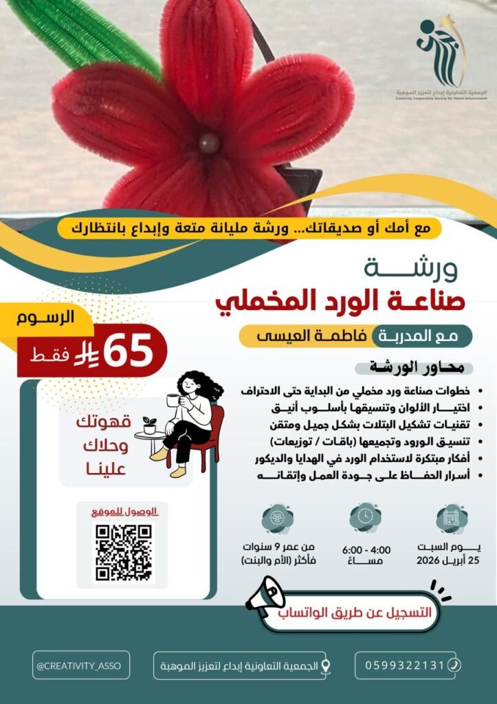 🔥🔥الموعد والرسوم: تقام الورشة يوم السبت، 25 أبريل 2026، من الساعة 4:00 إلى 6:00 مساءً، وتبلغ رسوم الاشتراك 65 ريالاً فقط.