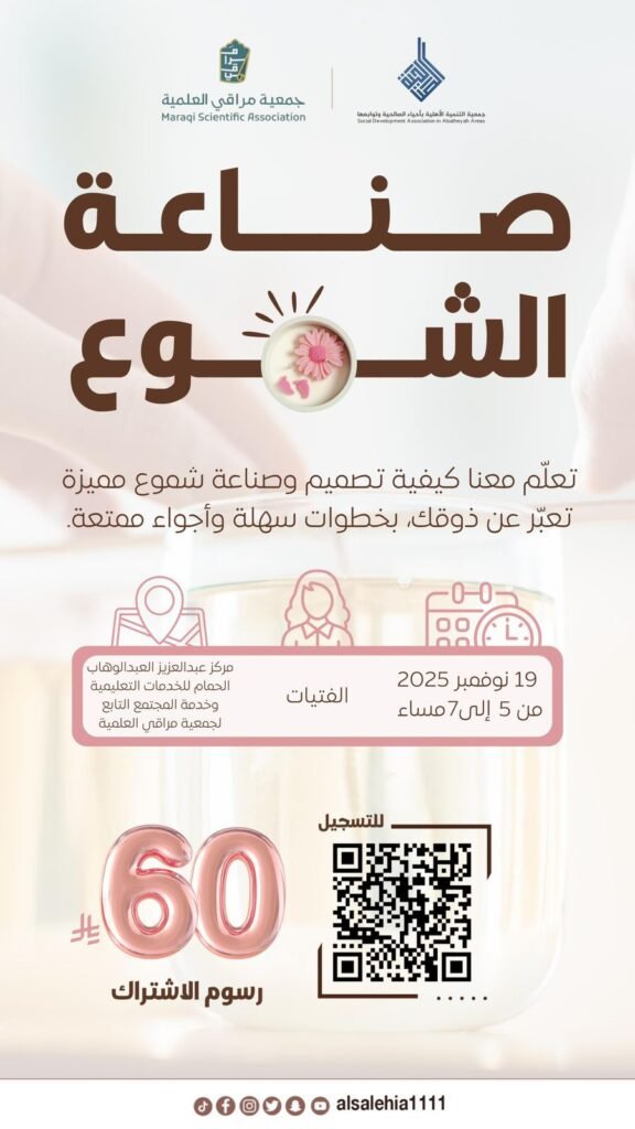 يدعوكم نادي الفتيات التابع لجمعية تنمية الصالحية لحضور ورشة عمل مميزة بعنوان “صناعة الشموع”. هذه الورشة موجهة للفتيات لتعلم فن صناعة الشموع.