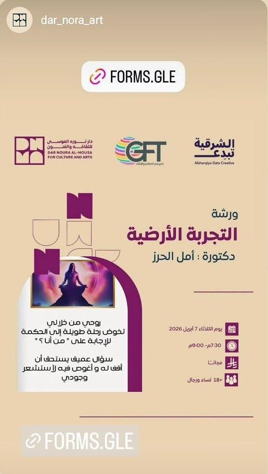ورشة عمل فنية وثقافية "التجربة الأرضية". 👌👌 تقدمها الدكتورة أمل الحرز. ⏱️⏱️الوقت والتاريخ: يوم الثلاثاء 7 أبريل 2026، من الساعة 7:30 مساءً وحتى 9:00 مساءً. 🚩🚩الفئة المستهدفة والتكلفة: الورشة مجانية ومتاحة للنساء والرجال فوق 18 سنة. 🏤🏤المكان: الإعلان مقدم من دار نورة الموسى للثقافة والفنون ضمن مبادرة "الشرقية تُبدع".