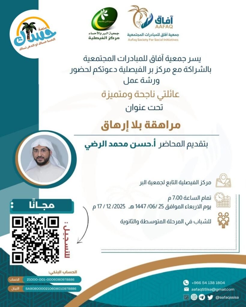 تدعوكم جمعية آفاق للمبادرات المجتمعية بالشراكة مع مركز بر الفيصلية لحضور ورشة عمل بعنوان “مراهقة بلا إرهاق” يقدمها المحاضر أ. حسن محمد الرضي.