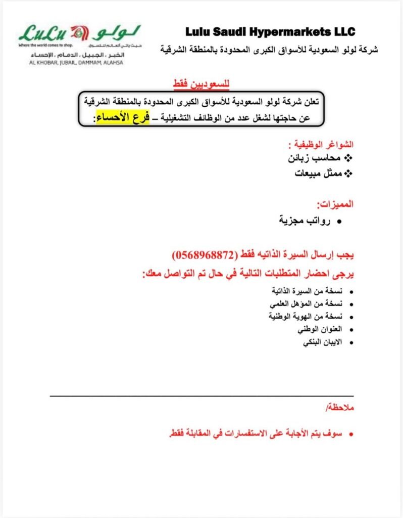 توظيف من شركة لولو السعودية للأسواق الكبرى المحدودة (فرع الأحساء)
