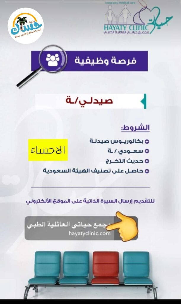 مطلوب صيدلي حديث التخرج في مجمع حياتي العائلية الطبي بالأحساء. الشروط المطلوبة: بكالوريوس صيدلة، سعودي/ة الجنسية، حديث التخرج، وحاصل على تصنيف الهيئة السعودية.