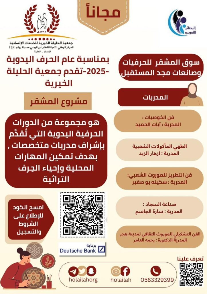 بمناسبة عام الحرف اليدوية 2025، يقدّم معهد البصائر – الهفوف وبالتعاون مع جمعية الحليلة الخيرية مجموعة من الدورات الحرفية التراثية مجانًا بإشراف نخبة من المدربات المتخصصات.