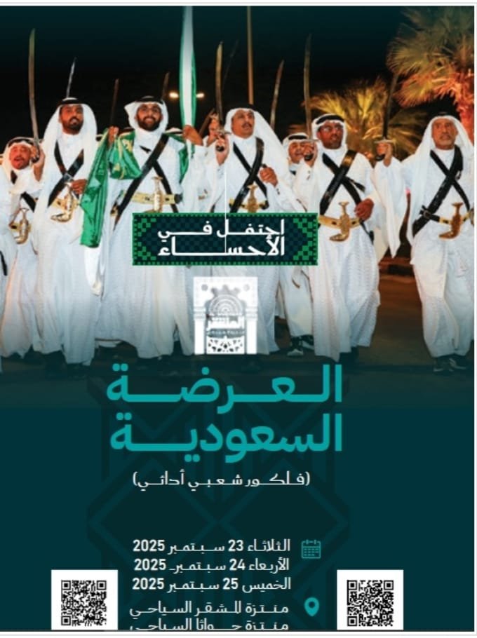 تُقام فعاليات العرضة السعودية (فلكلور شعبي أدائي) ضمن احتفالات اليوم الوطني السعودي الـ95 في الأحساء، وتشتمل الفعاليات على عروض ثقافية وتراثية وموسيقية بالإضافة إلى الألعاب النارية.