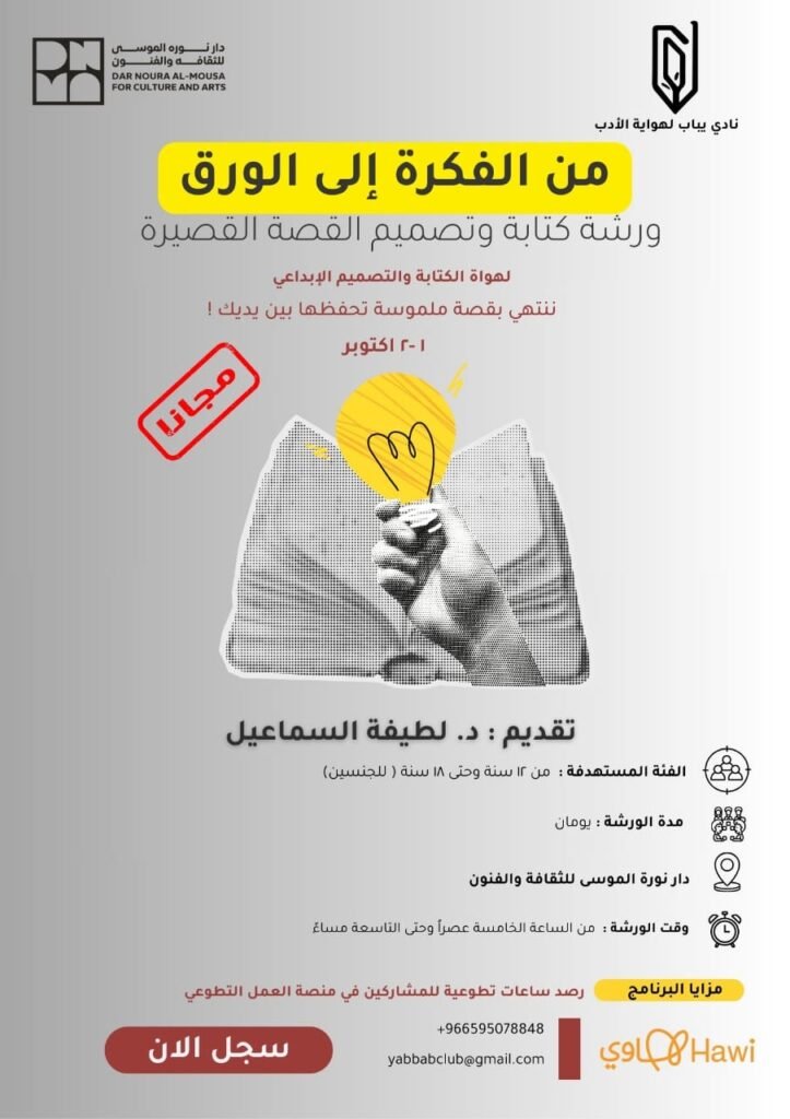 انضموا لورشة تطوعية مجانية يومي الأربعاء والخميس من الساعة 5:00 مساءً حتى 9:00 مساءً في دار نورة الموسى.