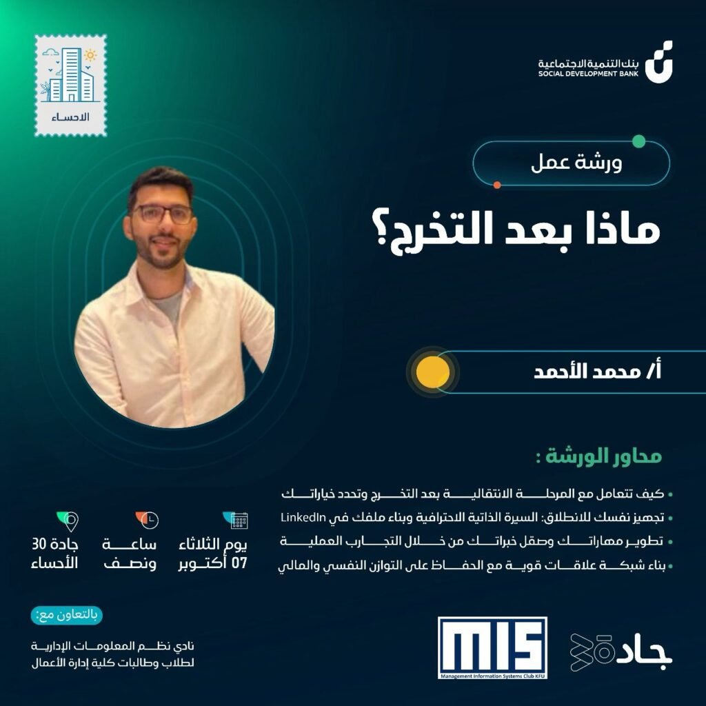 ورشة موجهة لخرّيجي وخرّيجات كلية إدارة الأعمال والمقبلين على التخرّج، تنظمها جــادّة30 بالتعاون مع نادي نظم المعلومات الإدارية (MIS)، وتستعرض تجارب عملية تساعدك على بدء مسيرتك المهنية بثقة والتعرّف على فرص سوق العمل.