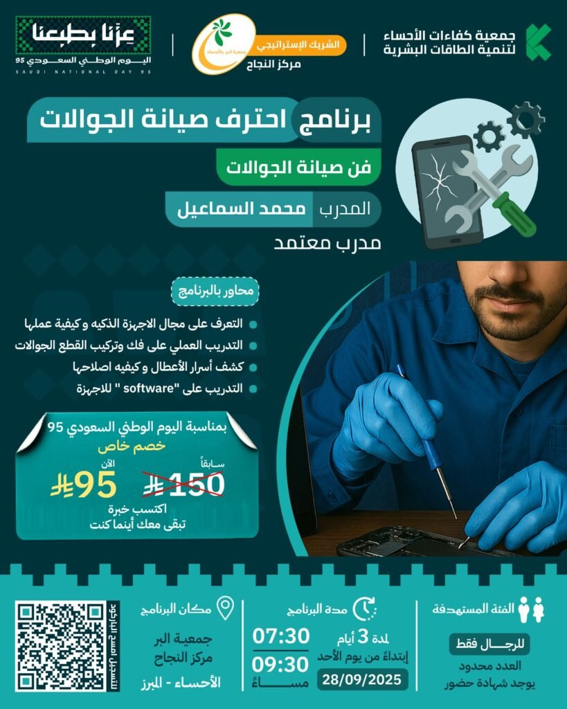 📢 تُقدّم جمعية كفاءات الأحساء لتنمية الطاقات البشرية دورة تدريبية مجانية في صيانة الجوالات.
