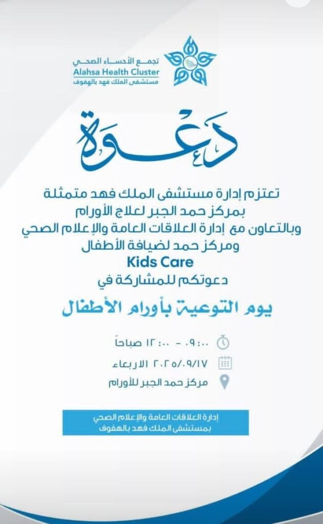 تطلق إدارة مستشفى الملك فهد بالهفوف ممثلة بمركز حمد الجبر لعلاج الأورام، بالتعاون مع إدارة العلاقات العامة والإعلام الصحي ومركز حمد لضيافة الأطفال (Kids Care) دعوة لحضور فعالية توعوية موجهة للعامة.