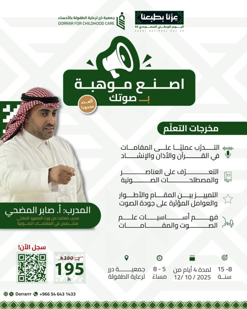 دعوة للأطفال من سن 8 إلى 15 سنة للمشاركة في برنامج صوتي تدريبي مع المدرب المعتمد صابر المضحي، متخصص في المقامات الصوتية.