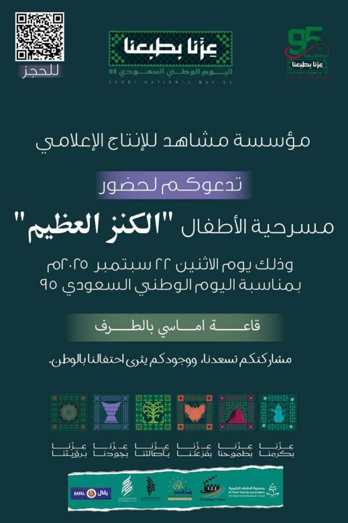 مؤسسة مشاهد للإنتاج الإعلامي بالتعاون مع جمعية الطيف الخيرية تقدّم عرضاً مسرحيّاً للأطفال بمناسبة اليوم الوطني السعودي 95.