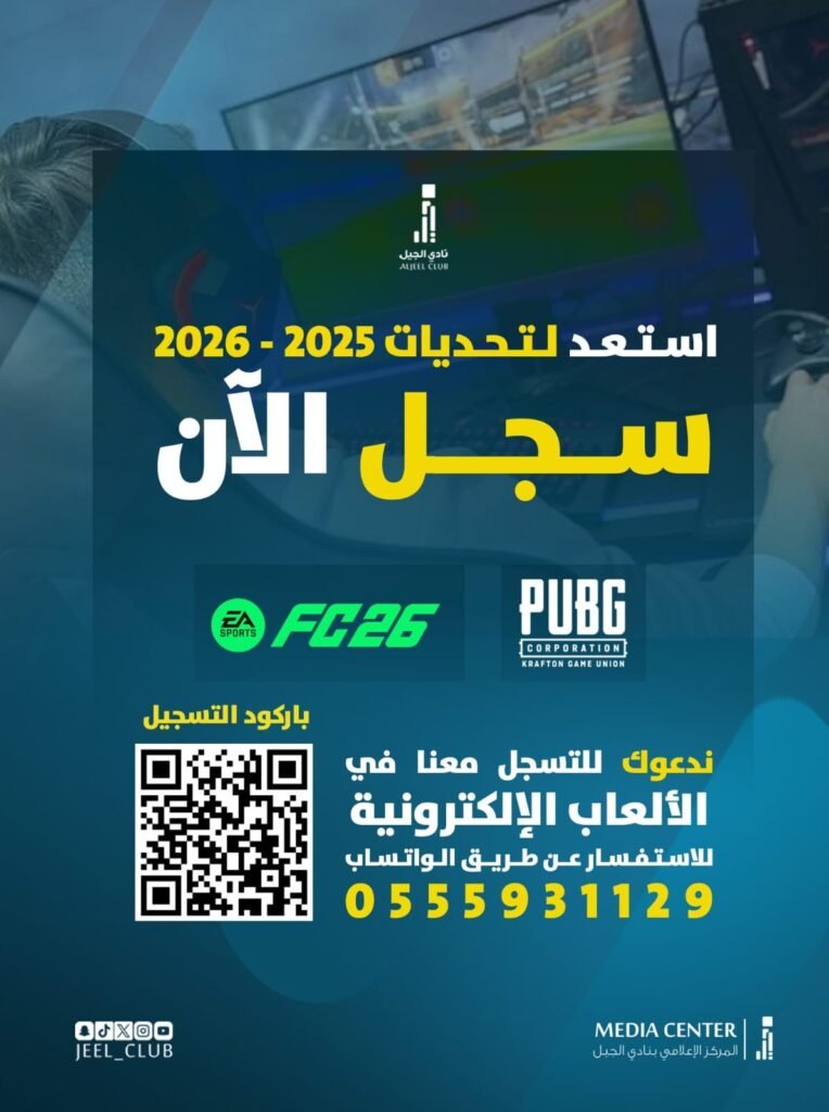 انضم إلى فعاليات ونشاطات نادي الجيل وشارك في تحديات ممتعة ومثيرة. للمزيد من التفاصيل أو التسجيل، اضغط على الرابط أدناه.