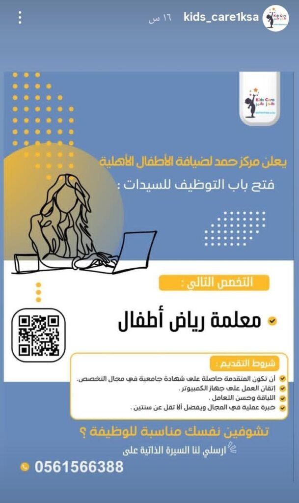 👩🏫📣 توظيف معلمة رياض أطفال – مركز حمد لضيافة الأطفال الأهلية