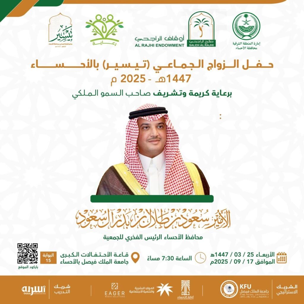 إعلان عن إقامة حفل زواج جماعي (تيسير) في الأحساء.