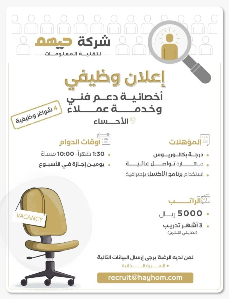 تعلن شركة حيهم لتقنية المعلومات عن وظيفة شاغرة بأحساء.