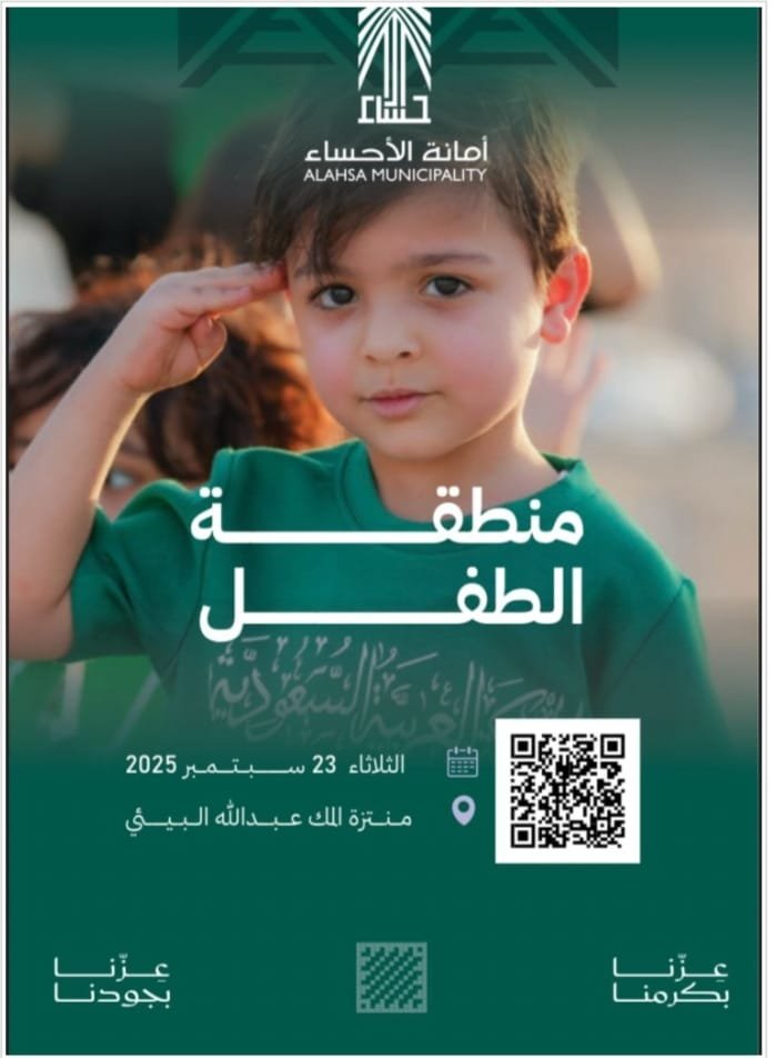 تدعوكم أمانة الأحساء للمشاركة في فعالية منطقة الطفل التي تُقام يوم الثلاثاء 23 سبتمبر 2025 في منتزه الملك عبدالله البيئي بالأحساء، ضمن أجواء مليئة بالفرح والأنشطة المخصّصة للأطفال.
