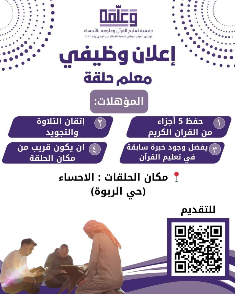 تعلن جمعية تعليم القرآن وعلومه بالأحساء عن حاجتها إلى معلم حلقة للعمل في جامع عبدالله الملحم بحي الربوة.