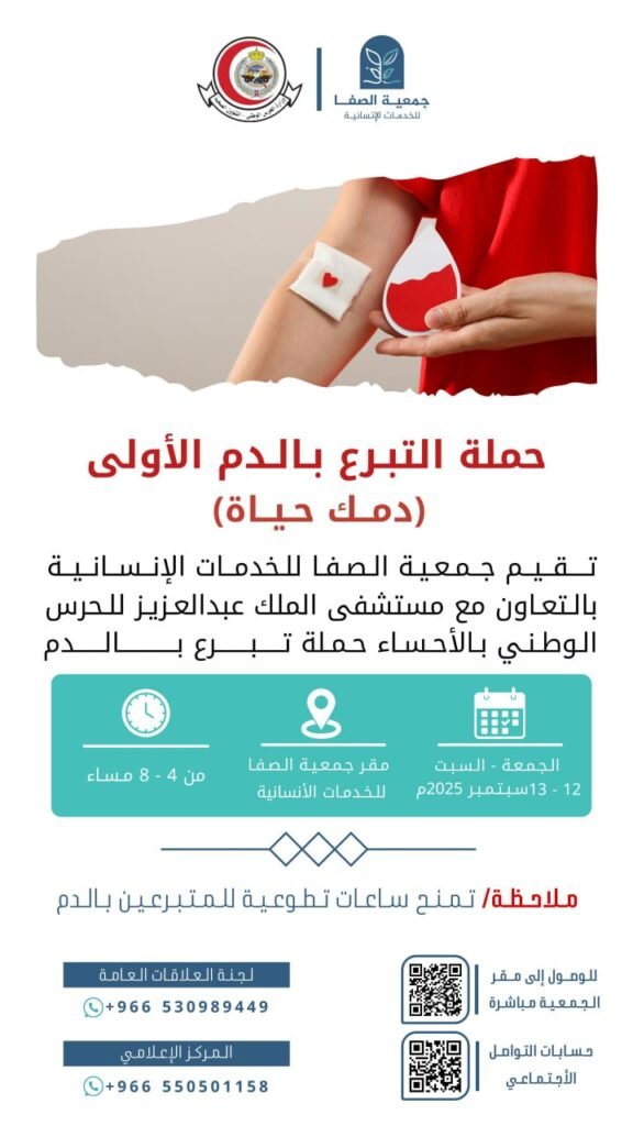قطرة دم منك قد تصنع حياة جديدة لإنسان آخر. ندعوكم للمشاركة في حملة التبرع بالدم التي تقيمها جمعية الصفا للخدمات الإنسانية بالتعاون مع مستشفى الملك عبدالعزيز للحرس الوطني بالأحساء.