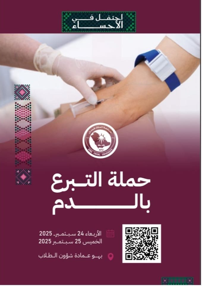 تنظم جامعة الملك فيصل حملة للتبرع بالدم يومي الأربعاء 24 سبتمبر 2025 والخميس 25 سبتمبر 2025.