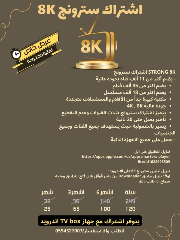اشتراك “سترونج IPTV” يقدم العديد من المميزات، بما في ذلك مجموعة واسعة من القنوات التلفزيونية المباشرة، مكتبة ضخمة من الأفلام والمسلسلات، وجودة بث عالية تصل إلى 4K و8K، ودعم لترجمة متعددة اللغات، بالإضافة إلى واجهة سهلة الاستخدام على مختلف الأجهزة.